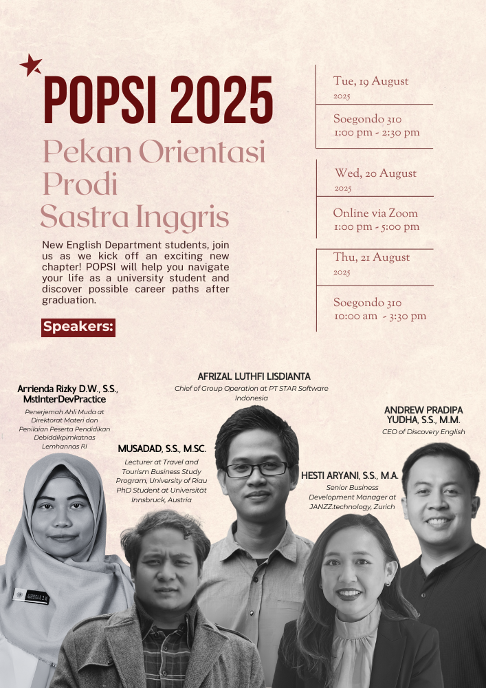 Pekan Orientasi Prodi Sastra Inggris (POPSI) is an annual event organized by the English Studies Program to welcome new students. The event is designed to provide new students with essential information about the study program, academic opportunities, and career paths. POPSI aims to motivate students to engage actively in their studies and offers guidance on navigating their academic journey. The event features sessions with faculty members and alumni, who share their experiences and insights. These sessions help students plan their academic journey and explore the various career opportunities.